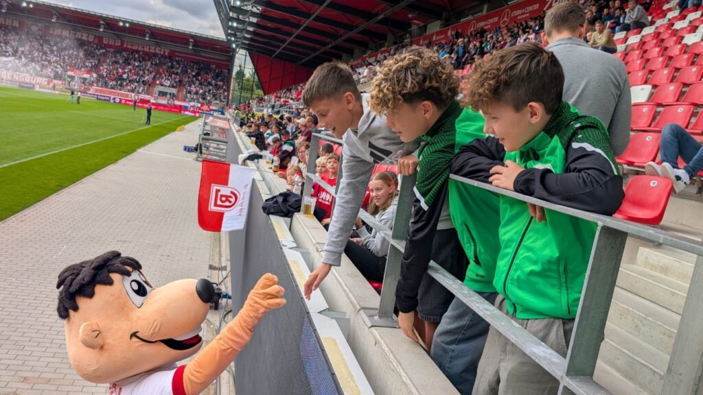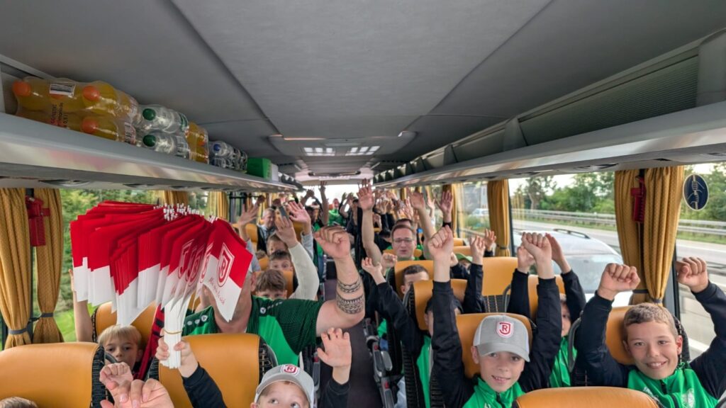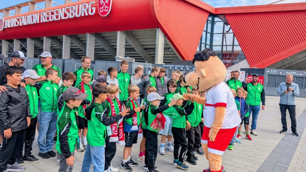 Mit dem Bus ging es am Vormittag los. Nach einer kleinen Stärkung unterwegs wurde erst einmal ein großes Gruppenfoto gemacht – und schon wartete die erste Überraschung: Jahni das Maskottchen des SSV Jahn ließ es sich nicht nehmen, unsere Kids persönlich zu begrüßen!